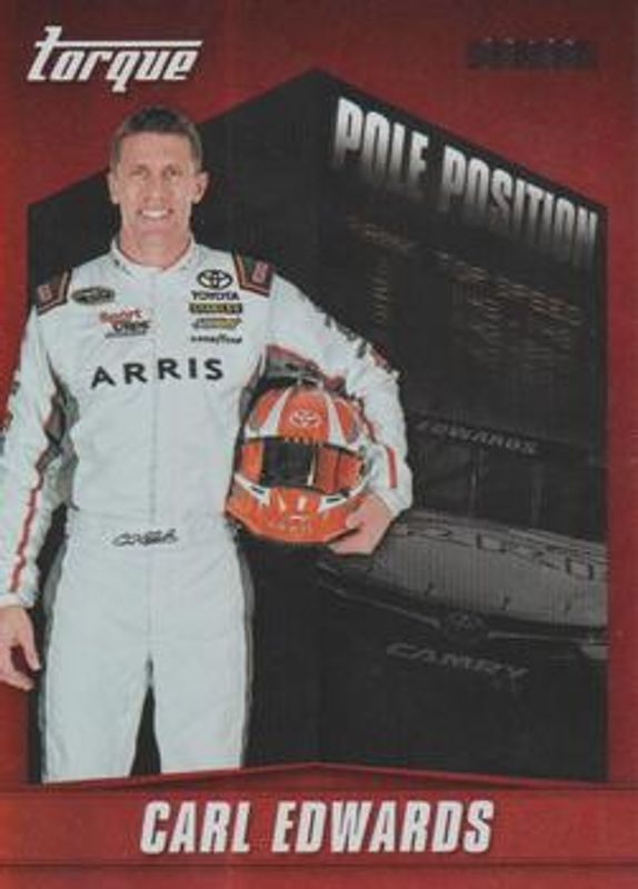 The Carl Edwards 2016 Torque NASCAR #PP5 Pole Position Red /49 card is 1 of 104 Carl Edwards' card variations in the 2016 Torque NASCAR set being tracked by Sports Card Investor, including #82 Base, #5 Base, #82 Gold, #5 Gold, and #82 Blue /125.