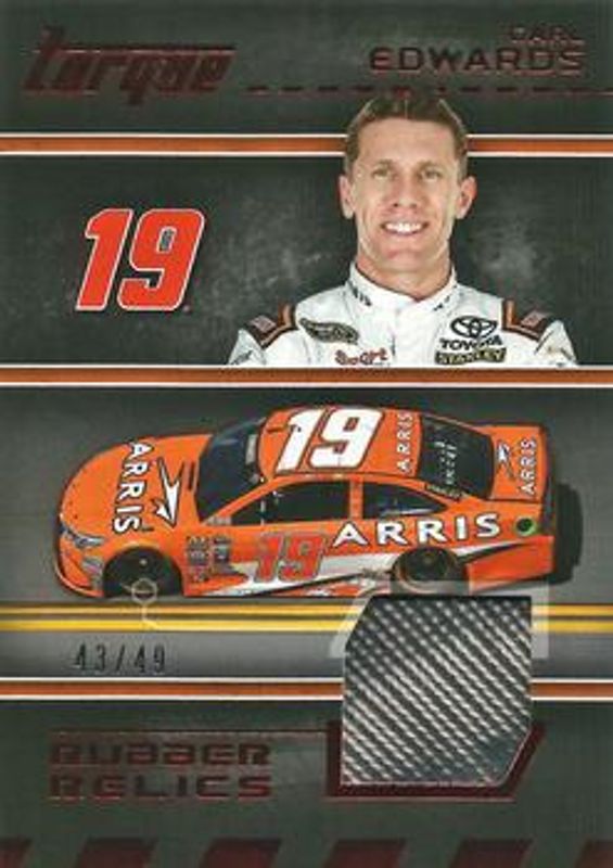 The Carl Edwards 2016 Torque NASCAR #RR-CE Rubber Relics Red /49 card is 1 of 104 Carl Edwards' card variations in the 2016 Torque NASCAR set being tracked by Sports Card Investor, including #82 Base, #5 Base, #82 Gold, #5 Gold, and #82 Blue /125.