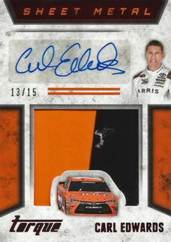The Carl Edwards 2016 Torque NASCAR #SSM-CE Silhouettes Sheet Metal Signatures Red /10 card is 1 of 104 Carl Edwards' card variations in the 2016 Torque NASCAR set being tracked by Sports Card Investor, including #82 Base, #5 Base, #82 Gold, #5 Gold, and #82 Blue /125.
