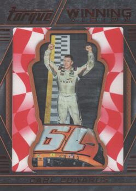 The Carl Edwards 2016 Torque NASCAR #WV5 Winning Vision Red /49 card is 1 of 104 Carl Edwards' card variations in the 2016 Torque NASCAR set being tracked by Sports Card Investor, including #82 Base, #5 Base, #82 Gold, #5 Gold, and #82 Blue /125.