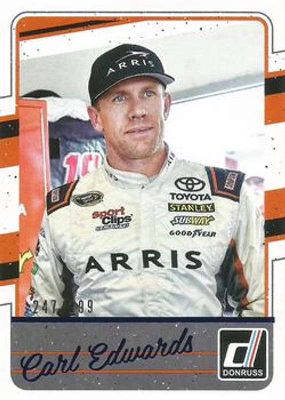 The Carl Edwards 2017 Donruss NASCAR #45a Blue Foil /299 card is 1 of 76 Carl Edwards' card variations in the 2017 Donruss NASCAR set being tracked by Sports Card Investor, including #45b Base, #12 Base, #130 Base, #144 Base, and #45a Base.