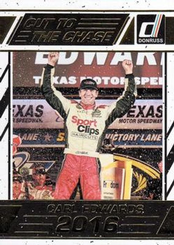 The Carl Edwards 2017 Donruss NASCAR #CC8 Cut to the Chase card is 1 of 76 Carl Edwards' card variations in the 2017 Donruss NASCAR set being tracked by Sports Card Investor, including #45b Base, #12 Base, #130 Base, #144 Base, and #45a Base.