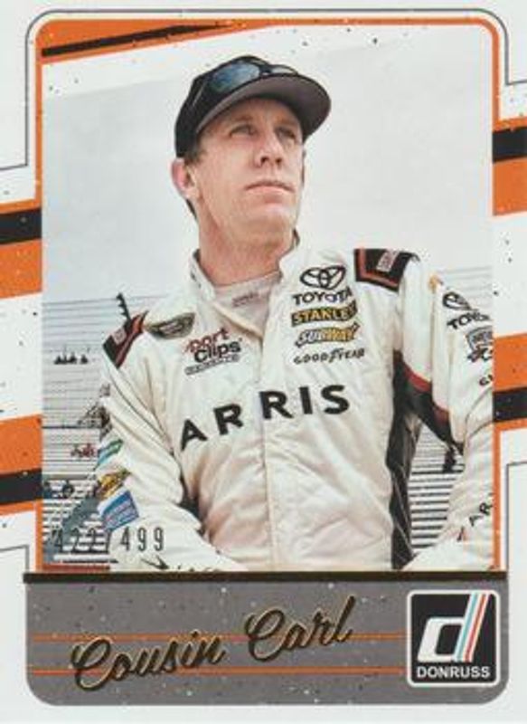 The Carl Edwards 2017 Donruss NASCAR #45b Gold Foil /499 card is 1 of 76 Carl Edwards' card variations in the 2017 Donruss NASCAR set being tracked by Sports Card Investor, including #45b Base, #12 Base, #130 Base, #144 Base, and #45a Base.
