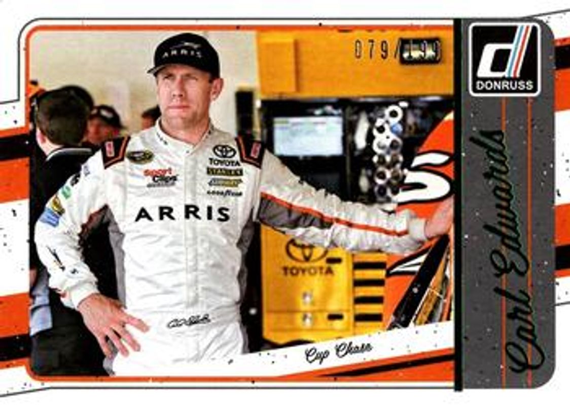 The Carl Edwards 2017 Donruss NASCAR #130 Green Foil /199 card is 1 of 76 Carl Edwards' card variations in the 2017 Donruss NASCAR set being tracked by Sports Card Investor, including #45b Base, #12 Base, #130 Base, #144 Base, and #45a Base.