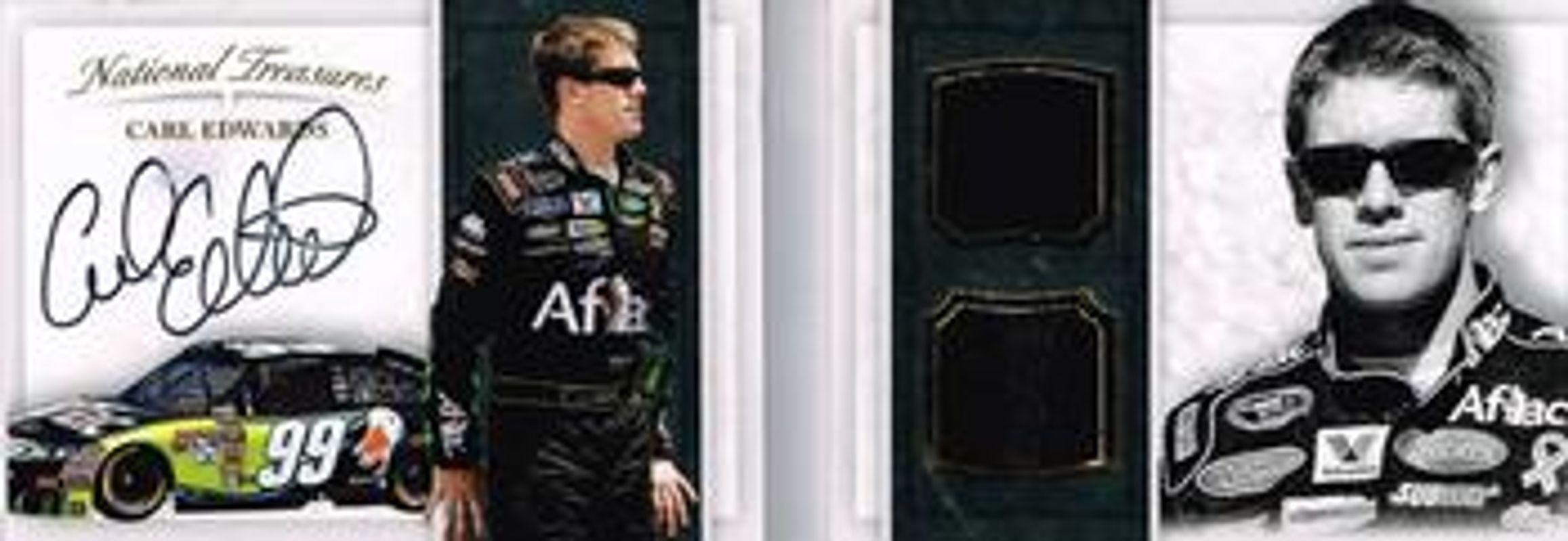 The Carl Edwards 2017 National Treasures NASCAR #BCM-ED Booklet Combo Material Signatures Gold /15 card is 1 of 86 Carl Edwards' card variations in the 2017 National Treasures NASCAR set being tracked by Sports Card Investor, including Base /25, Century Holo Silver /20, Century Gold /15, Century Holo Gold /10, and Century Green /5.