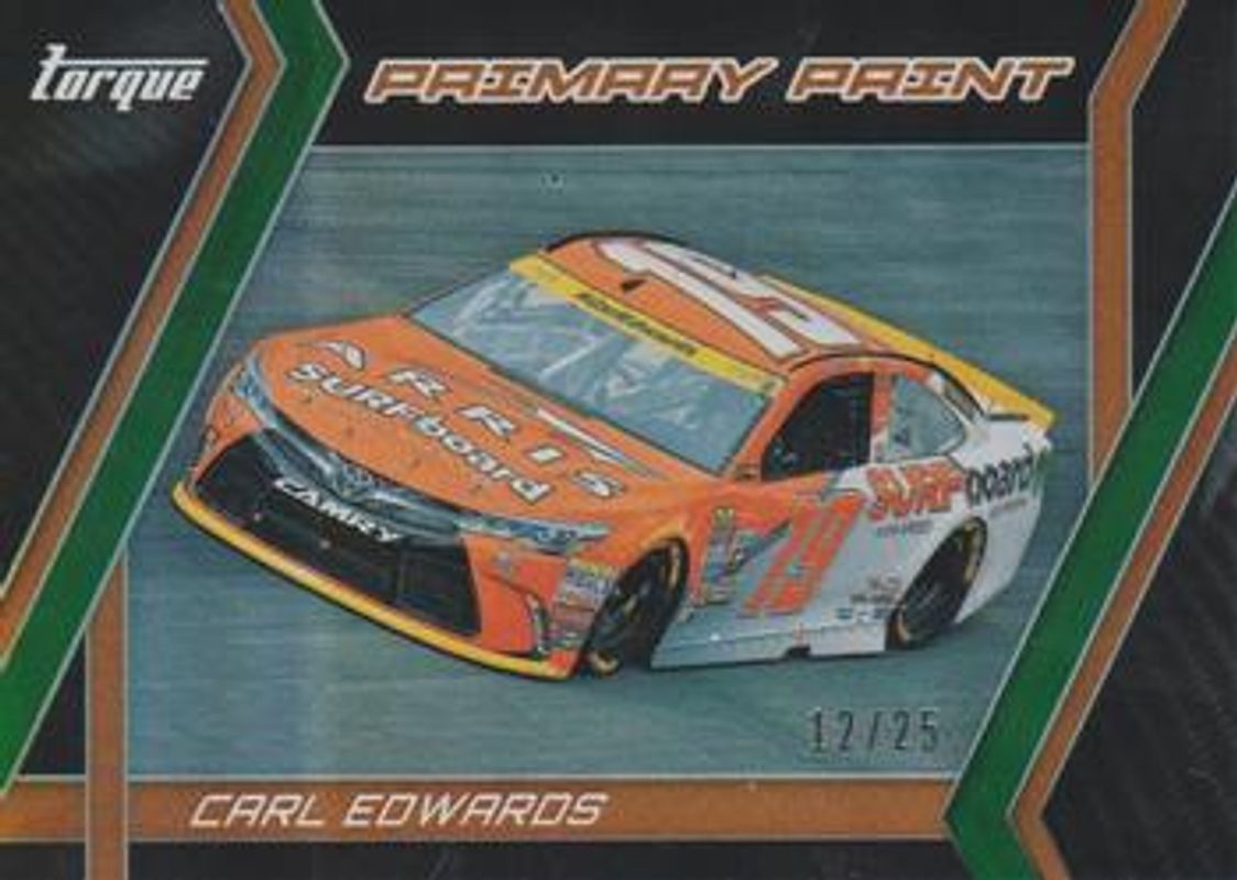 The Carl Edwards 2017 Torque NASCAR #PP19 Primary Paint Green /25 card is 1 of 58 Carl Edwards' card variations in the 2017 Torque NASCAR set being tracked by Sports Card Investor, including Base, Gold, Blue /150, Red /100, and Artist Proof /75.