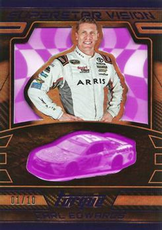 The Carl Edwards 2017 Torque NASCAR #SV6 Superstar Vision Purple /10 card is 1 of 58 Carl Edwards' card variations in the 2017 Torque NASCAR set being tracked by Sports Card Investor, including Base, Gold, Blue /150, Red /100, and Artist Proof /75.