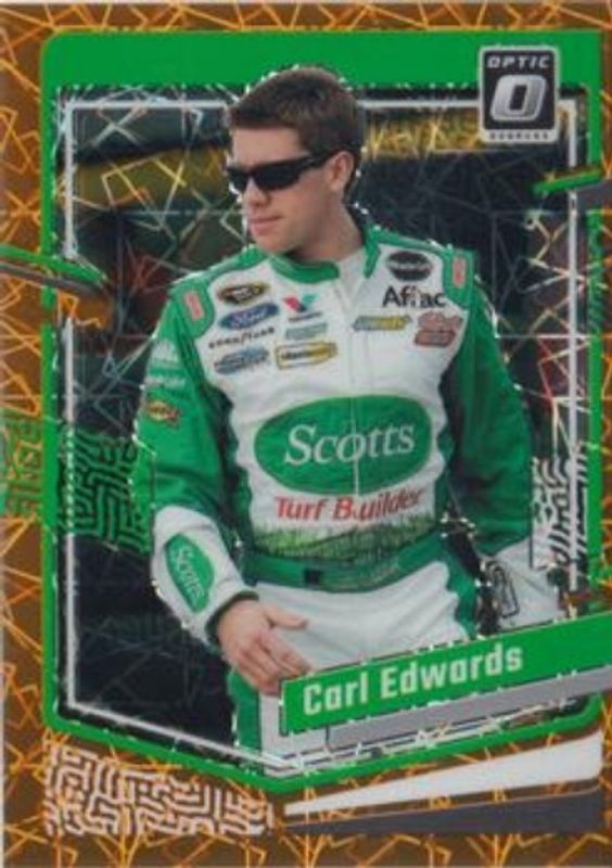 The Carl Edwards 2024 Donruss NASCAR #53 Optic Orange Velocity card is 1 of 50 Carl Edwards' card variations in the 2024 Donruss NASCAR set being tracked by Sports Card Investor, including Base, Optic, Optic Black Pandora, Optic Blue Velocity, and Optic Holo.