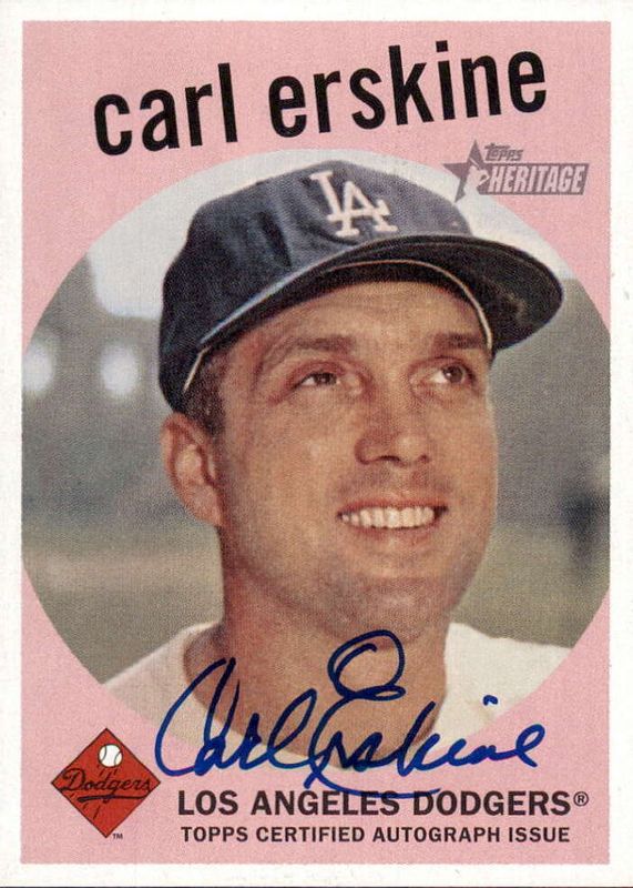 This card is 1 of 3 Carl Erskine's card variations in the 2008 Topps Heritage set being tracked by Sports Card Investor, including 50th Anniversary Buybacks, and Real One Autographs - Red Ink /59.