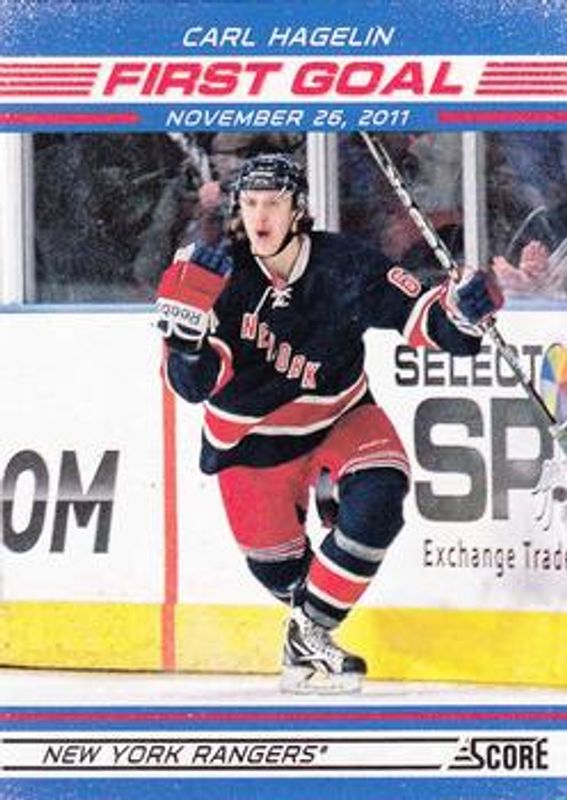 The Carl Hagelin 2012 Score #FG7 First Goal card is 1 of 9 Carl Hagelin's card variations in the 2012 Score set being tracked by Sports Card Investor, including #11 Base, #317 Base, #317 Black Ice, #11 Black Ice, and #317 Gold Rush.