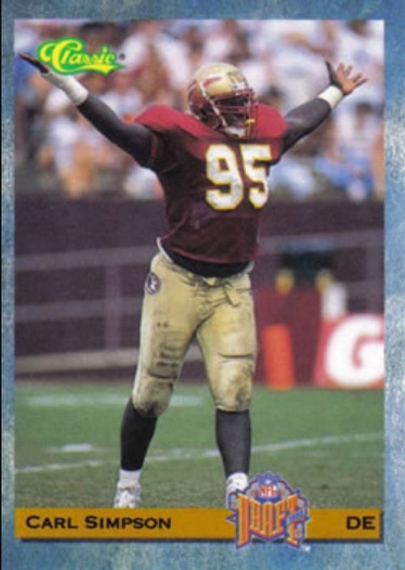 The Carl Simpson 1993 Classic #96 Base Rookie card is 1 of 2 Carl Simpson's card variations in the 1993 Classic set being tracked by Sports Card Investor, including Gold.