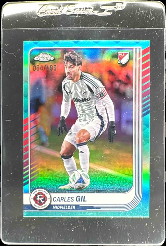 The Carles Gil 2025 Topps Chrome MLS #100 Aqua Refractor /199 card is 1 of 64 Carles Gil's card variations in the 2025 Topps Chrome MLS set being tracked by Sports Card Investor, including Base, Blue Lava Refractor, Frozenfractor, Mania Refractor, and Prism Refractor.