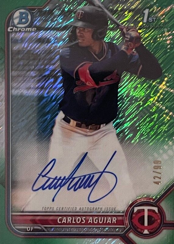 The Carlos Aguiar 2022 Bowman #CPA-CA Chrome Prospect Auto - Green Shimmer Refractor /99 (1st) card in Raw condition has not changed in price in the last 30 days and was last sold for $25.51 .