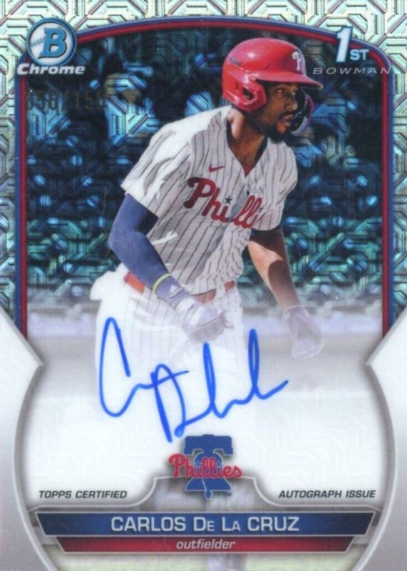 Best Prices Available For Sale of Carlos De La Cruz 2023 Bowman Chrome #CPA-CDC Prospect Auto - HTA Choice Mojo Refractor /150 (1st)