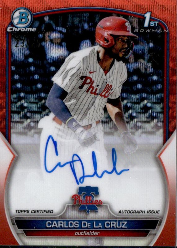 This card is 1 of 20 Carlos De La Cruz's card variations in the 2023 Bowman Chrome set being tracked by Sports Card Investor, including Prospect Auto (1st), Prospect Auto - Refractor /499 (1st), Prospect Auto - Speckle Refractor /299 (1st), Prospect Auto - Purple Refractor /250 (1st), and Prospect Auto - Blue RayWave Refractor /150 (1st).
