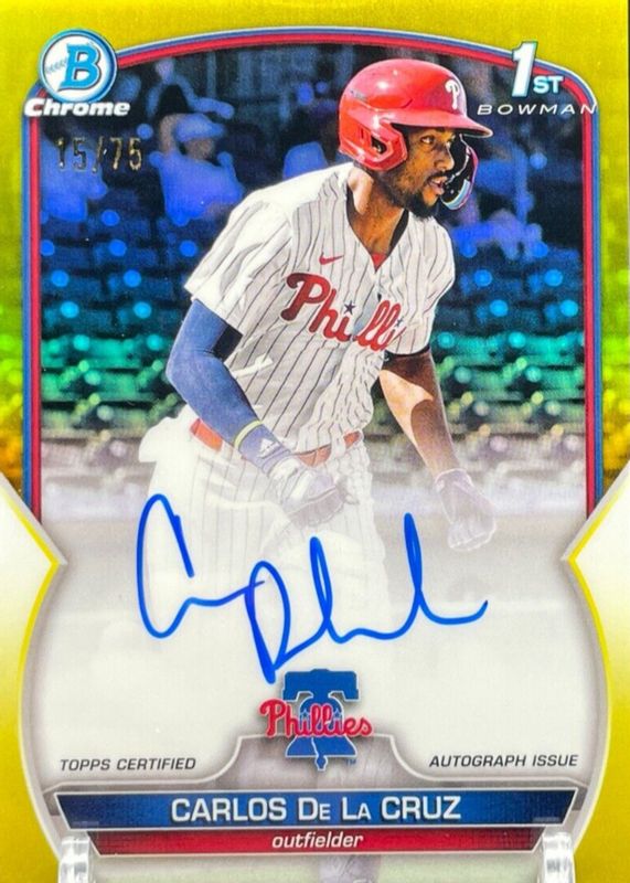 2023 Bowman Chrome 1st Carlos De La Cruz YELLOW REFRACTOR Auto #02/75 PHILLIES