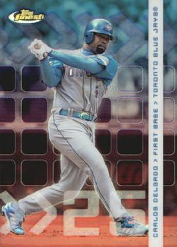 The Carlos Delgado 2002 Topps Finest #6 Refractor /499 card is 1 of 4 Carlos Delgado's card variations in the 2002 Topps Finest set being tracked by Sports Card Investor, including Base, Jersey Relics, and X-Fractor /299.