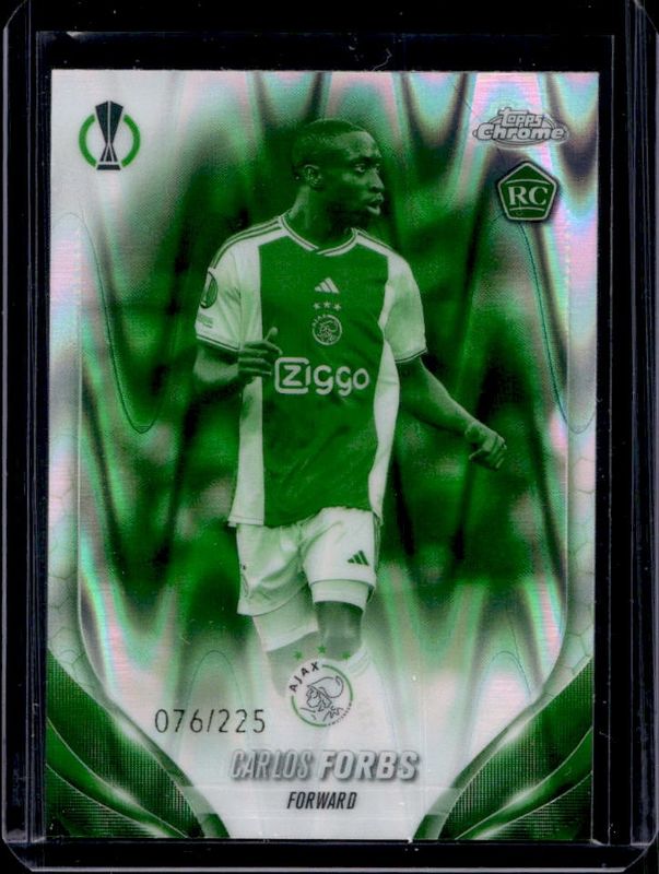 The Carlos Forbs 2023 Topps Chrome UEFA Club Competitions #90 Night Vision RayWave Refractor /225 Rookie card is 1 of 36 Carlos Forbs' card variations in the 2023 Topps Chrome UEFA Club Competitions set being tracked by Sports Card Investor, including Base, Aqua Lava Refractor, Aqua Prism Refractor, Blue Lava Refractor, and Gold Lava Refractor.