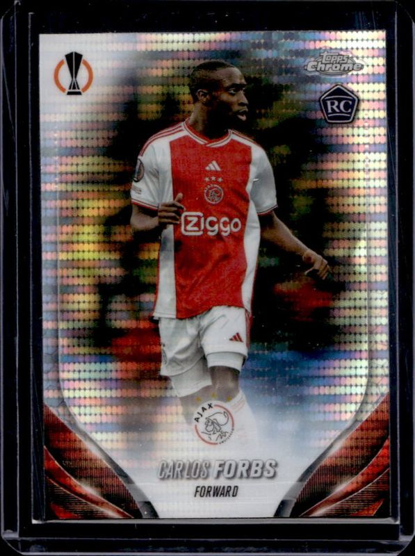 The Carlos Forbs 2023 Topps Chrome UEFA Club Competitions #90 Pulsar Refractor Rookie card is 1 of 36 Carlos Forbs' card variations in the 2023 Topps Chrome UEFA Club Competitions set being tracked by Sports Card Investor, including Base, Aqua Lava Refractor, Aqua Prism Refractor, Blue Lava Refractor, and Gold Lava Refractor.