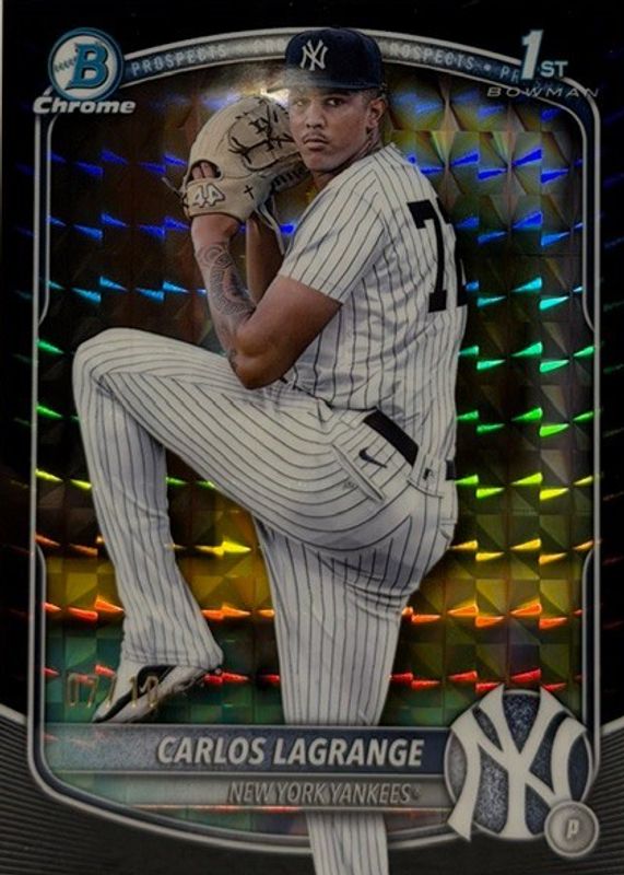 This card is 1 of 86 Carlos Lagrange's card variations in the 2025 Bowman Chrome set being tracked by Sports Card Investor, including Prospect Auto (1st), Prospect Auto - Black & White Shimmer Refractor (1st), Prospects (1st), Prospects - Mini-Diamond Refractor (1st), and Prospects - Shimmer Refractor (1st).