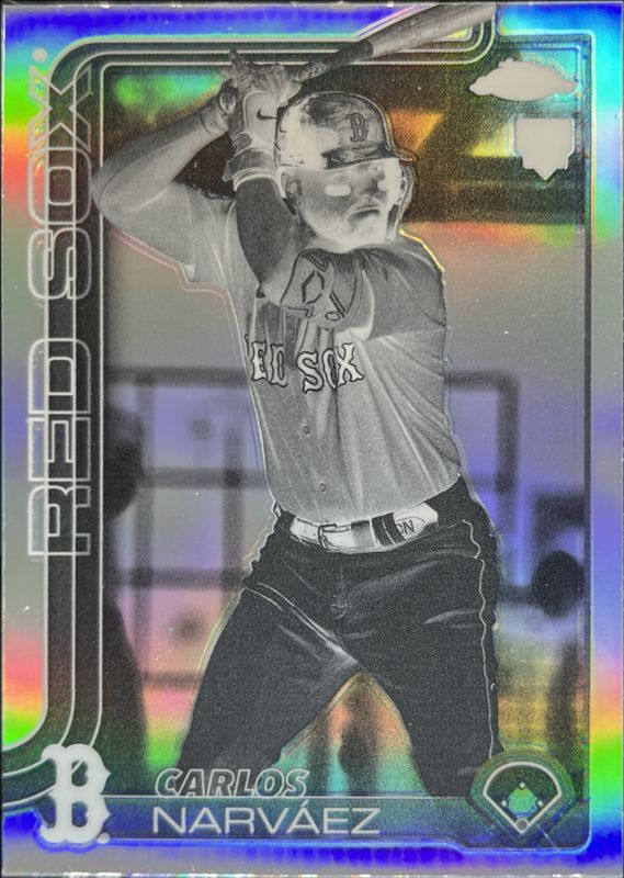 The Carlos Narvaez 2025 Topps Chrome #194 Negative Refractor Rookie card is 1 of 73 Carlos Narvaez's card variations in the 2025 Topps Chrome set being tracked by Sports Card Investor, including Base, Geometric Refractor, Lightboard Logo Variation, Prism Refractor, and RayWave Refractor.