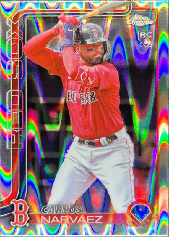 The Carlos Narvaez 2025 Topps Chrome #194 RayWave Refractor Rookie card is 1 of 73 Carlos Narvaez's card variations in the 2025 Topps Chrome set being tracked by Sports Card Investor, including Base, Geometric Refractor, Lightboard Logo Variation, Negative Refractor, and Prism Refractor.