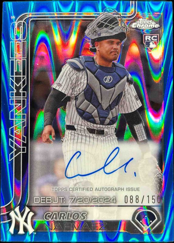 The Carlos Narvaez 2025 Topps Chrome Update #CRDA-CN Rookie Debut Autographs - Blue RayWave Refractor /150 card is 1 of 22 Carlos Narvaez's card variations in the 2025 Topps Chrome Update set being tracked by Sports Card Investor, including Rookie Debut Autographs, Rookie Debut Autographs - Black & White Mini-Diamond Refractor, Rookie Debut Autographs - Refractor /499, Rookie Debut Autographs - Purple Speckle Refractor /299, and Rookie Debut Autographs - Purple Refractor /250.