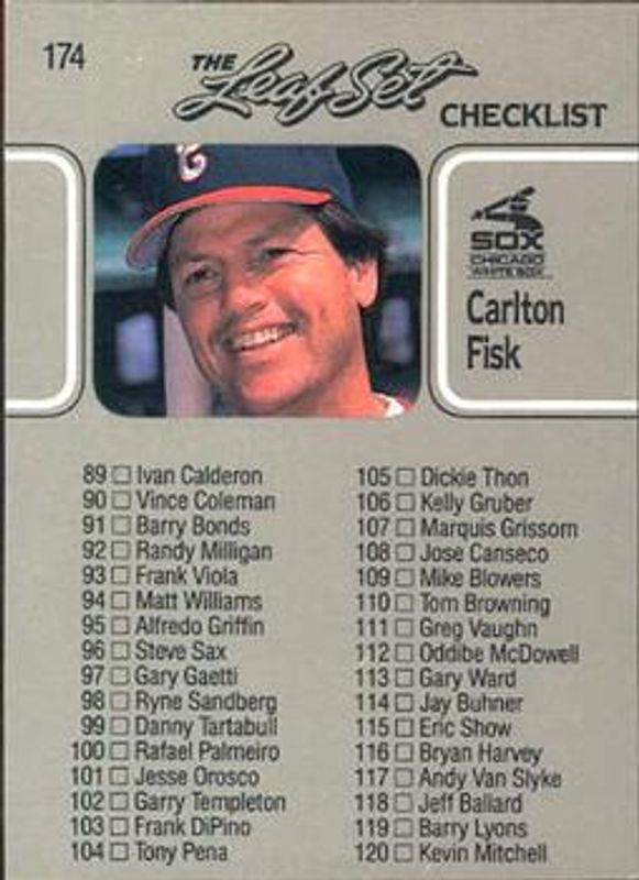 The Carlton Fisk 1990 Leaf #174 Base card is 1 of 2 Carlton Fisk's card variations in the 1990 Leaf set being tracked by Sports Card Investor, including Base.