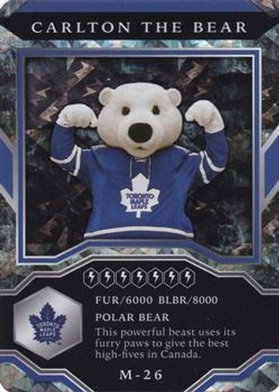 The Carlton The Bear 2021 Upper Deck MVP #M-26 Mascots Gaming Sparkle card is 1 of 6 Carlton The Bear's card variations in the 2021 Upper Deck MVP set being tracked by Sports Card Investor, including Mascots Gaming, Mascot Gaming - Printing Plates Black /1, Mascot Gaming - Printing Plates Cyan /1, Mascot Gaming - Printing Plates Magenta /1, and Mascot Gaming - Printing Plates Yellow /1.