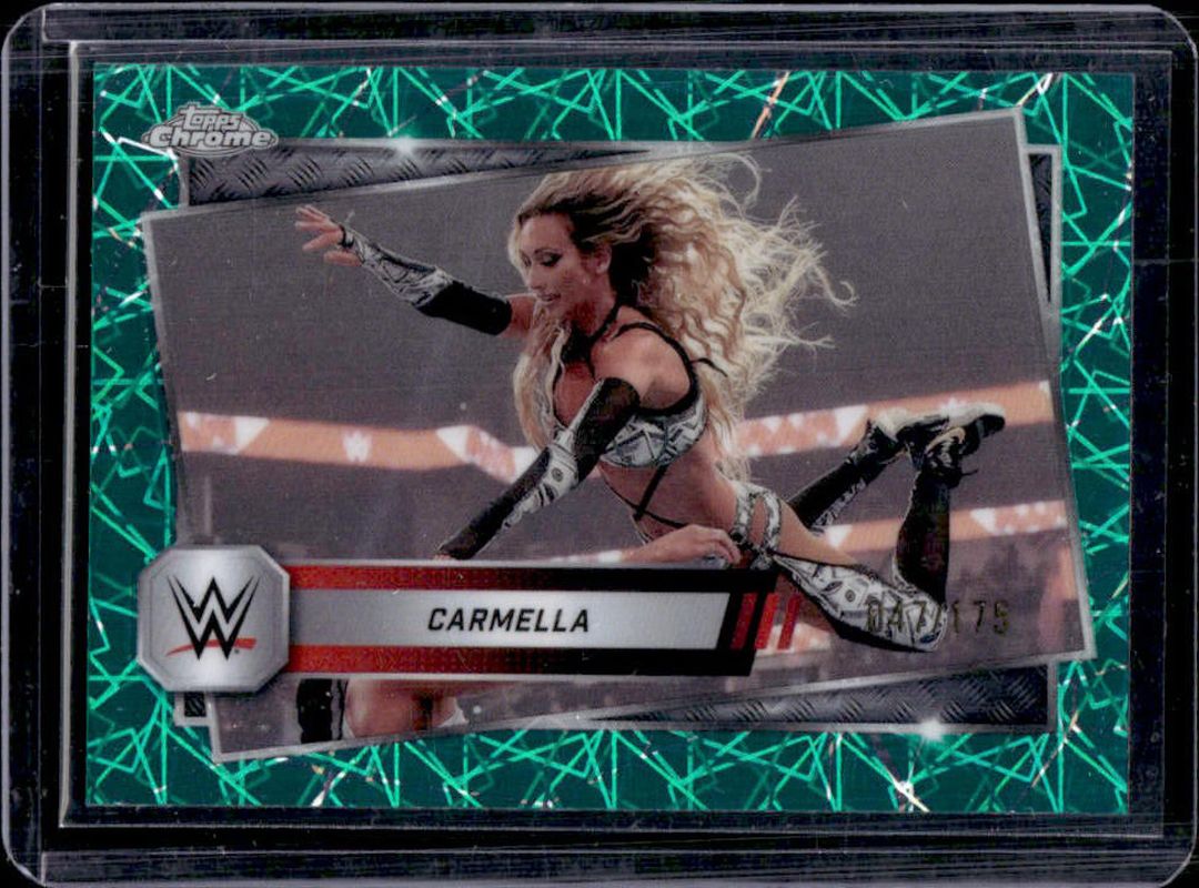 The Carmella 2025 Topps Chrome WWE #145 Teal Lazer Refractor /175 card is 1 of 20 Carmella's card variations in the 2025 Topps Chrome WWE set being tracked by Sports Card Investor, including Black & Gold Refractor, Geometric Refractor, Neon Green & Black Refractor, Pink Shimmer Refractor, and Prism Refractor.