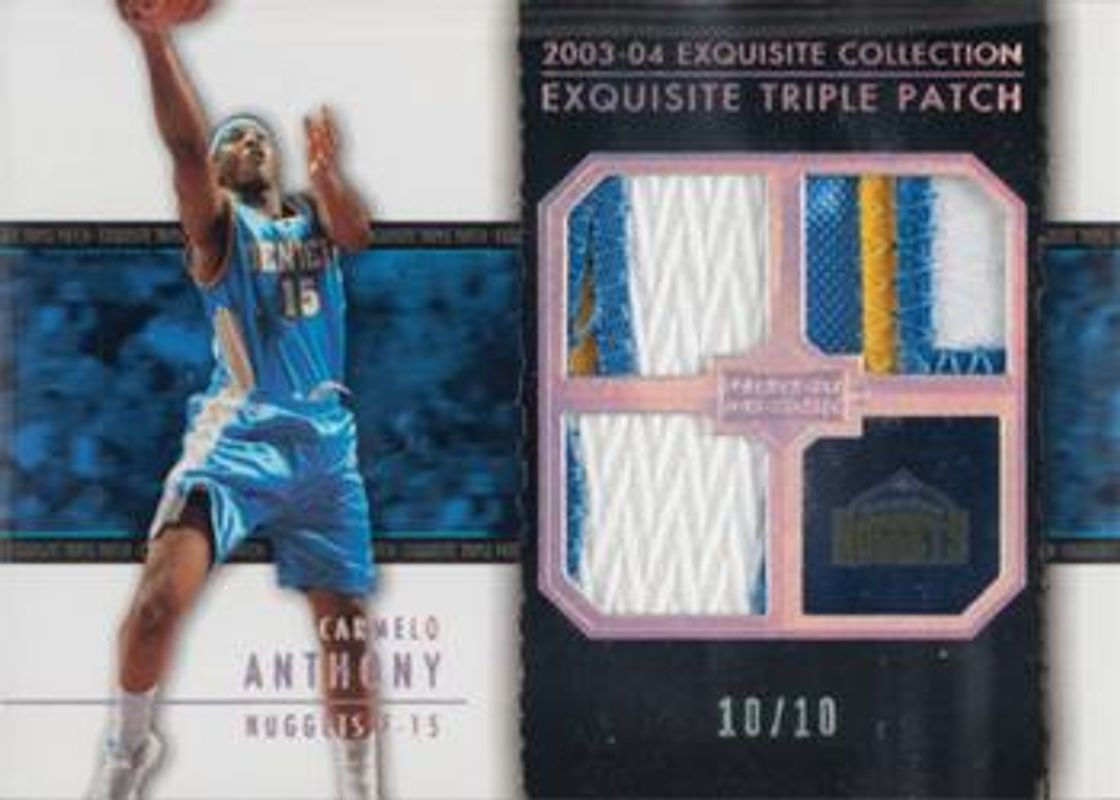 The Carmelo Anthony 2003 Upper Deck Exquisite Collection #E3P-CA Patches Triple /10 Rookie card is 1 of 17 Carmelo Anthony's card variations in the 2003 Upper Deck Exquisite Collection set being tracked by Sports Card Investor, including Base /225, Gold /25, Rainbow /1, Number Pieces Patch Autographs (/15), and Rookie Patch Auto (/99).