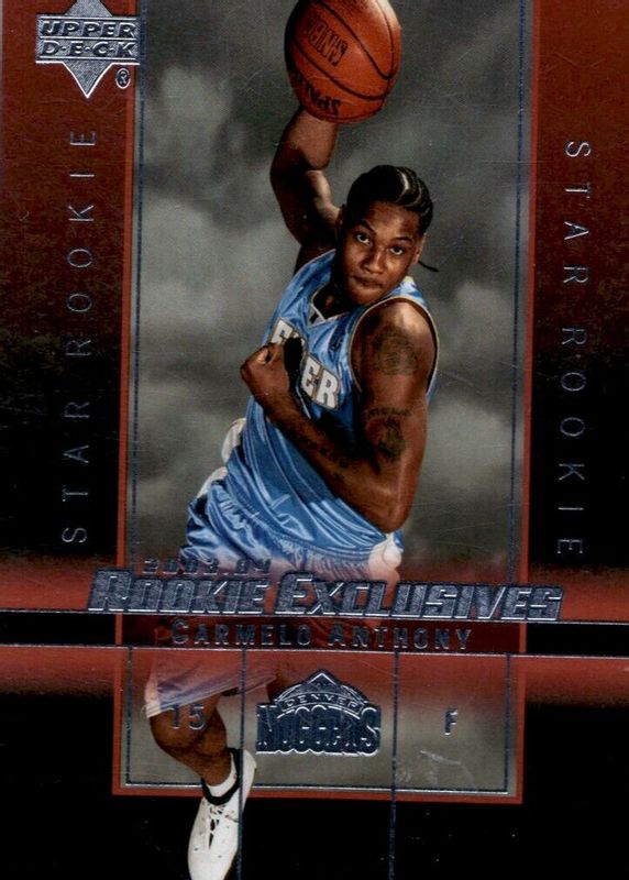 The Carmelo Anthony 2003 Upper Deck Rookie Exclusives #3 Base card in Raw condition has moved down -$5.43 (-67.9%) in the last 30 days and was last sold for $2.57 .