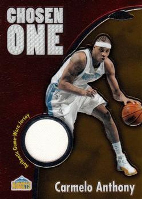 The Carmelo Anthony 2005 Topps Chrome #CO-CA Chosen One /400 card is 1 of 16 Carmelo Anthony's card variations in the 2005 Topps Chrome set being tracked by Sports Card Investor, including Base, Refractor /999, Black Refractor /399, Chromographs /162, and Chosen One Relics Refractor /99.