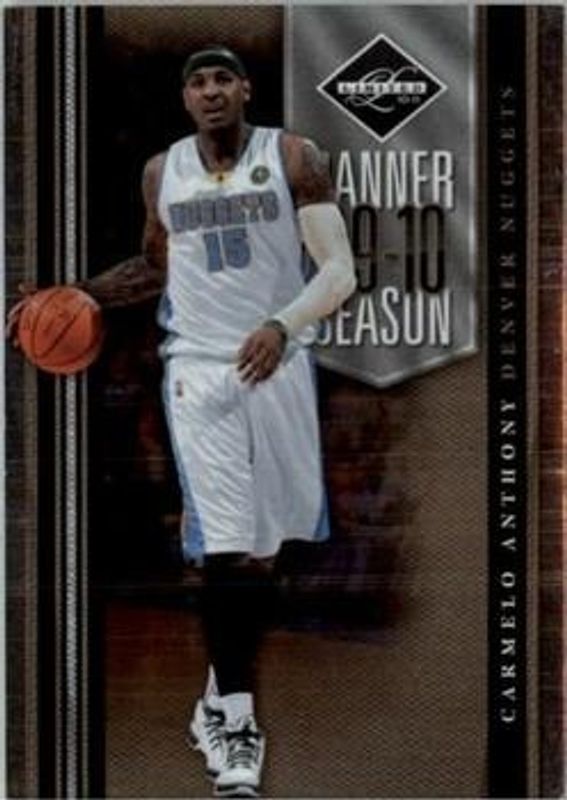 The Carmelo Anthony 2010 Limited #3 Banner Season /149 card is 1 of 24 Carmelo Anthony's card variations in the 2010 Limited set being tracked by Sports Card Investor, including Base /199, Silver Spotlight /149, Gold Spotlight /49, Platinum Spotlight /1, and Banner Season - Materials /99.
