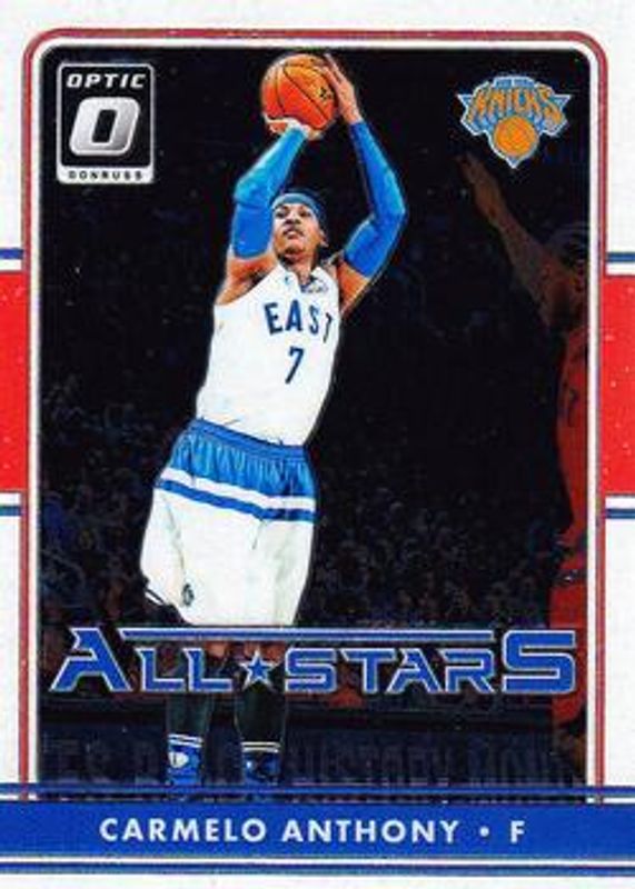 The Carmelo Anthony 2016 Optic #15 All Stars card is 1 of 40 Carmelo Anthony's card variations in the 2016 Optic set being tracked by Sports Card Investor, including Base, All Stars - Holo, Checkerboard, Court Kings, and Court Kings - Holo.