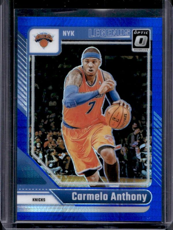 The Carmelo Anthony 2024 Optic #250 Legend - Hyper Blue /175 card is 1 of 80 Carmelo Anthony's card variations in the 2024 Optic set being tracked by Sports Card Investor, including Legend, Legend - Blue Velocity, Legend - Checkerboard, Legend - Choice, and Legend - Choice Dragon.