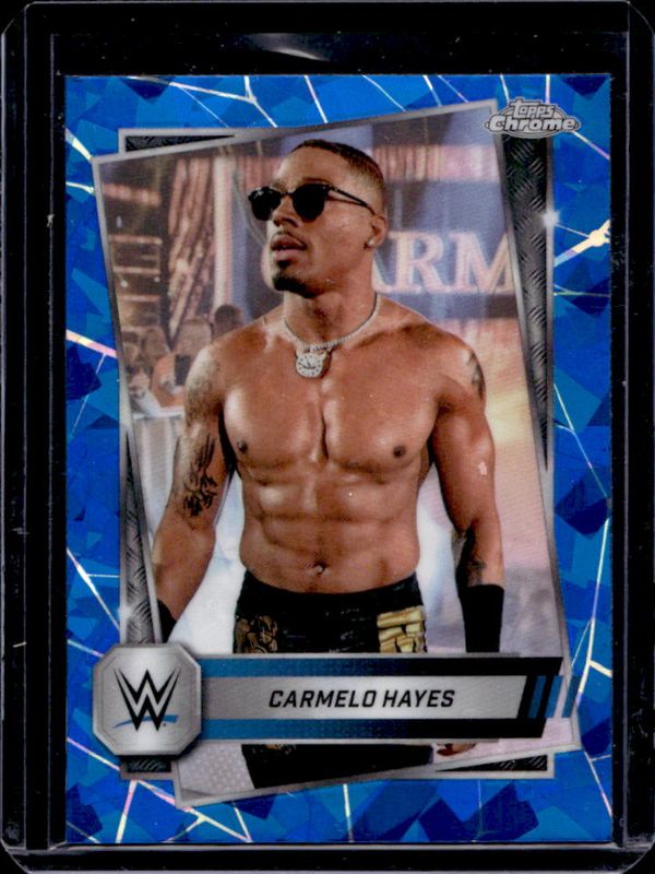 The Carmelo Hayes 2025 Topps Chrome WWE Sapphire Edition #165 Base Chrome card is 1 of 11 Carmelo Hayes' card variations in the 2025 Topps Chrome WWE Sapphire Edition set being tracked by Sports Card Investor, including Blue Brand Autographs, Base Chrome - Green Refractor /75, Base Chrome - Gold Refractor /50, Base Chrome - Orange Refractor /25, and Blue Brand Autographs - Orange Refractor /25.