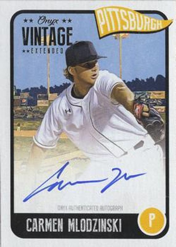 The Carmen Mlodzinski 2020 Onyx Vintage Extended #EACM Autographs - Blue card is 1 of 5 Carmen Mlodzinski's card variations in the 2020 Onyx Vintage Extended set being tracked by Sports Card Investor, including Base, Autographs - Green, Autographs - Red, and Autographs - Black /5.