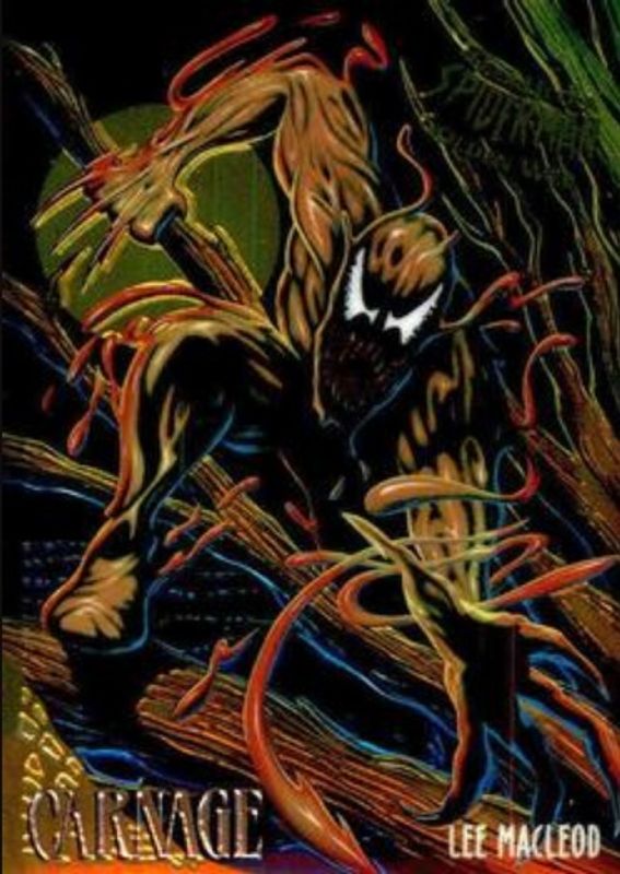 The Carnage 1995 Fleer Ultra Spider-Man #2 Golden Web card is 1 of 13 Carnage's card variations in the 1995 Fleer Ultra Spider-Man set being tracked by Sports Card Investor, including #12 Base, #84 Base, #147 Base, #139 Base, and #84 Gold Foil Signatures Series.