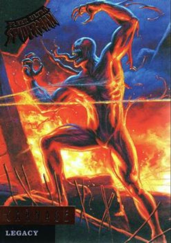 The Carnage 2017 Fleer Ultra Spider-Man #L3 Legacy card is 1 of 55 Carnage's card variations in the 2017 Fleer Ultra Spider-Man set being tracked by Sports Card Investor, including Base, Silver Web Foil, Gold Web Foil Autographs /49, Printing Plate Black /1, and Printing Plate Cyan /1.