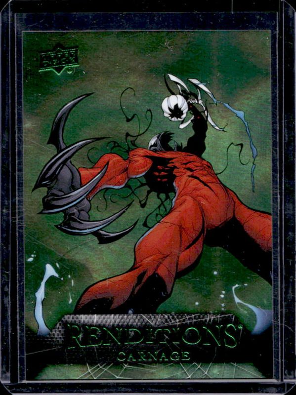 The Carnage 2024 Upper Deck Marvel Spider-Man Renditions #25 Goblin Green /399 card is 1 of 70 Carnage's card variations in the 2024 Upper Deck Marvel Spider-Man Renditions set being tracked by Sports Card Investor, including #29 Canvas Cover Variant, #21 Canvas Cover Variant, #25 Canvas Cover Variant, #34 Canvas Cover Variant, and #25 Legendary Responsibility Gaming Variant.