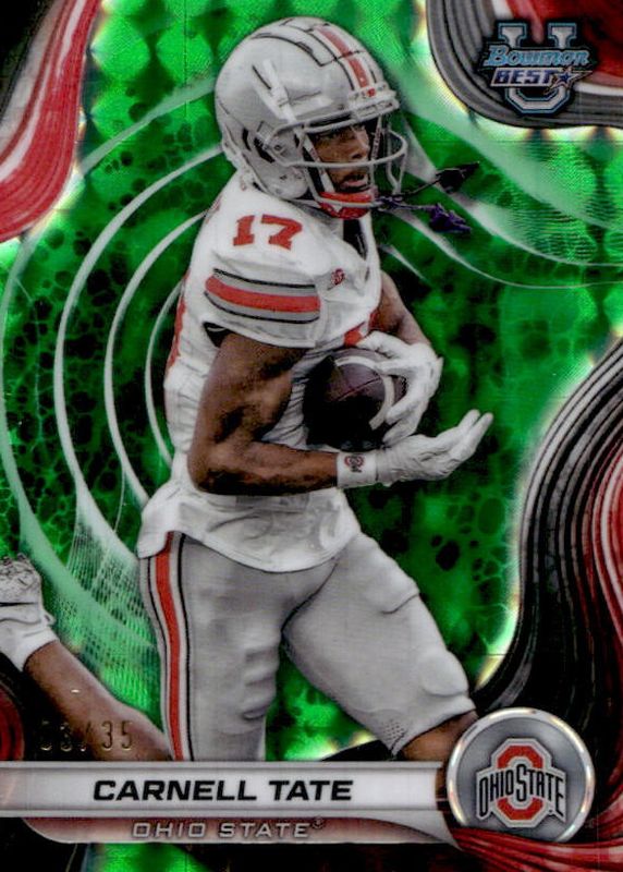 The Carnell Tate 2024 Bowman Best University #47 Lime Green Geometric Refractor /35 card in Raw condition has not changed in price in the last 30 days and was last sold for $18.00 .