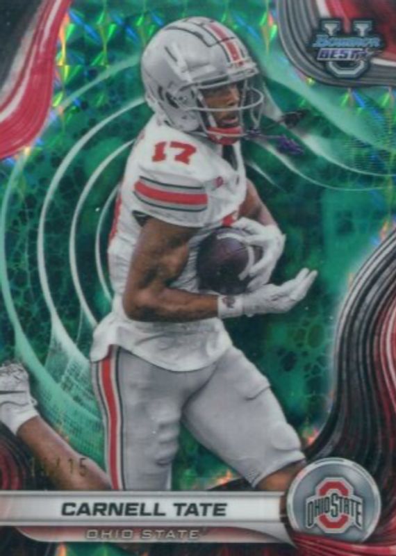 The Carnell Tate 2024 Bowman Best University #47 Teal Geometric Refractor /15 card in Raw condition has not changed in price in the last 30 days and was last sold for $38.00 .