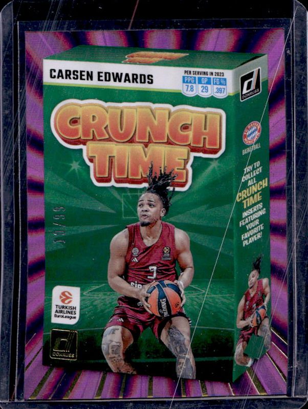 The Carsen Edwards 2023 Donruss EuroLeague #16 Crunch Time - Purple Laser /99 card is 1 of 31 Carsen Edwards' card variations in the 2023 Donruss EuroLeague set being tracked by Sports Card Investor, including Base, Optic, Optic - Holo, Press Proof Silver, and Yellow Flood.