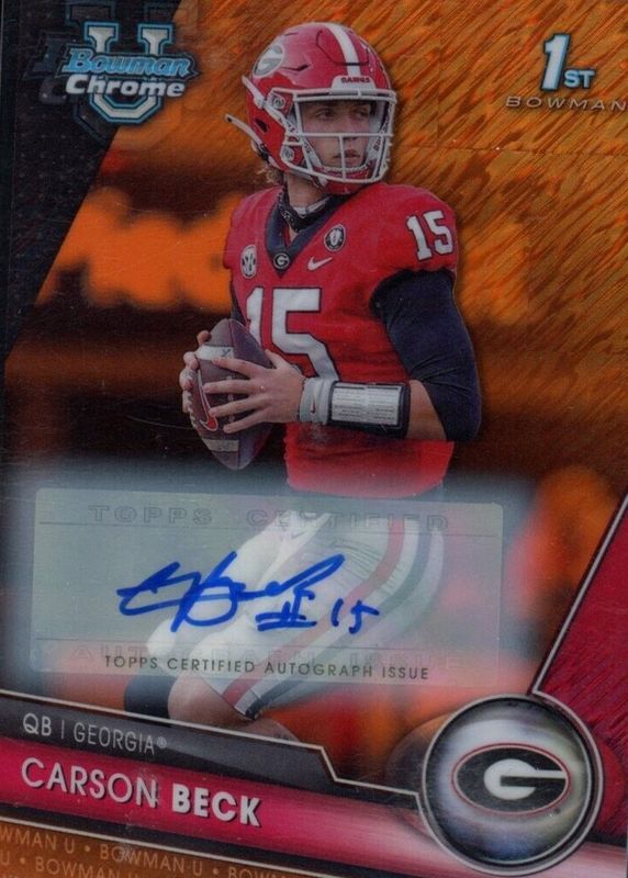 Auctions Ending Soon for Carson Beck 2023 Bowman Chrome University #44 Prospect Auto - Orange Shimmer Refractor /25 (1st) RAW