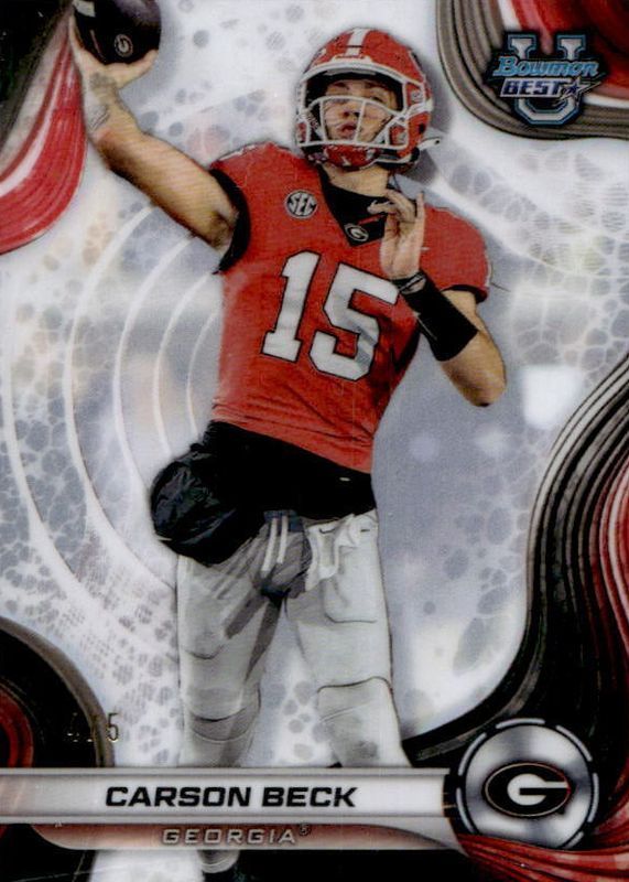 This card is 1 of 35 Carson Beck's card variations in the 2024 Bowman Best University set being tracked by Sports Card Investor, including Base, Refractor, Speckle Refractor, Aqua Refractor /225, and Blue Refractor /149.