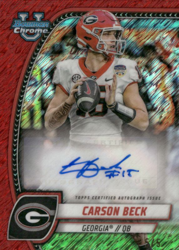 Auctions Ending Soon for Carson Beck 2024 Bowman Chrome University #PA-CBE Prospect Auto - Red Shimmer Refractor /5 PSA 9