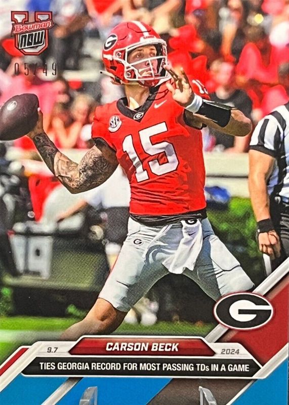 This card is 1 of 18 Carson Beck's card variations in the 2024 Bowman U Now set being tracked by Sports Card Investor, including #25 Base (Print Run: 982), #49 Base (Print Run: 371), #8 Base (Print Run: 2,004), #8 Blue /49, and #49 Blue /49.