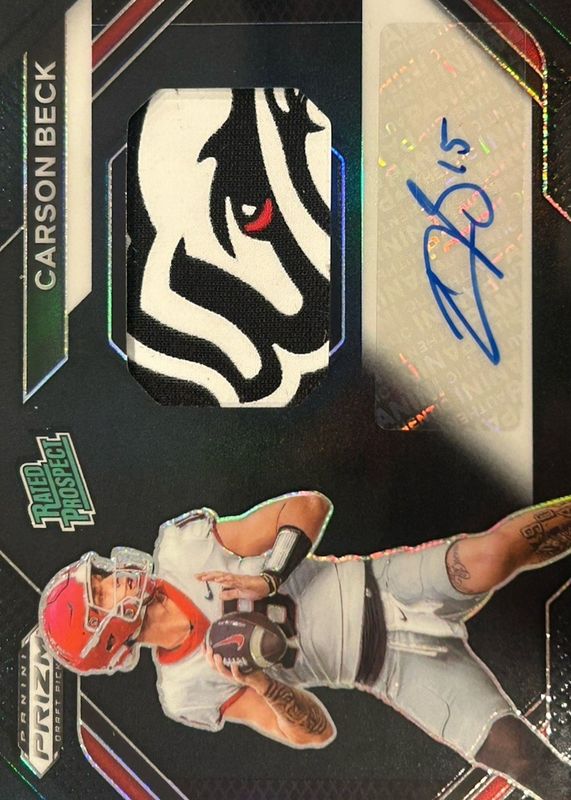 The Carson Beck 2024 Prizm Draft Picks #PPA-CBK Prospects Patch Autographs - Black /1 card in Raw condition has not changed in price in the last 30 days and was last sold for $158.37 .