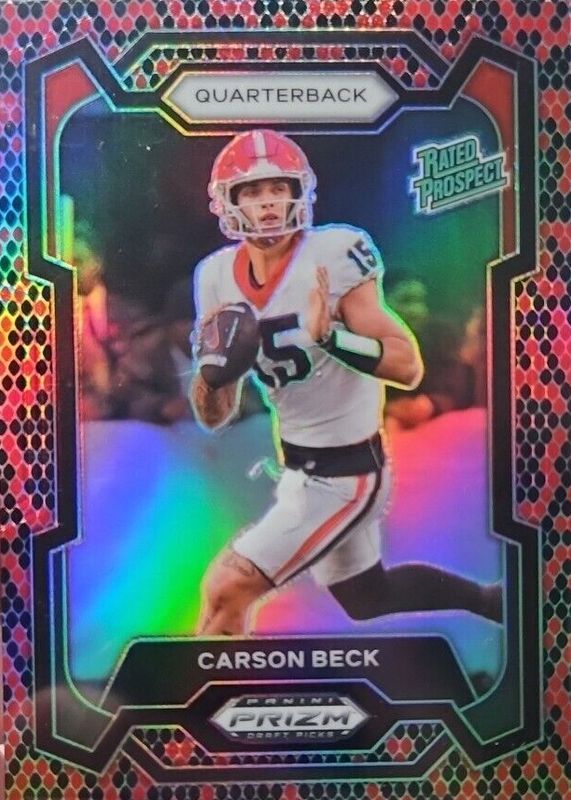 The Carson Beck 2024 Prizm Draft Picks #130 Snakeskin /(SSP) card in Raw condition has not changed in price in the last 30 days and was last sold for $31.30 .